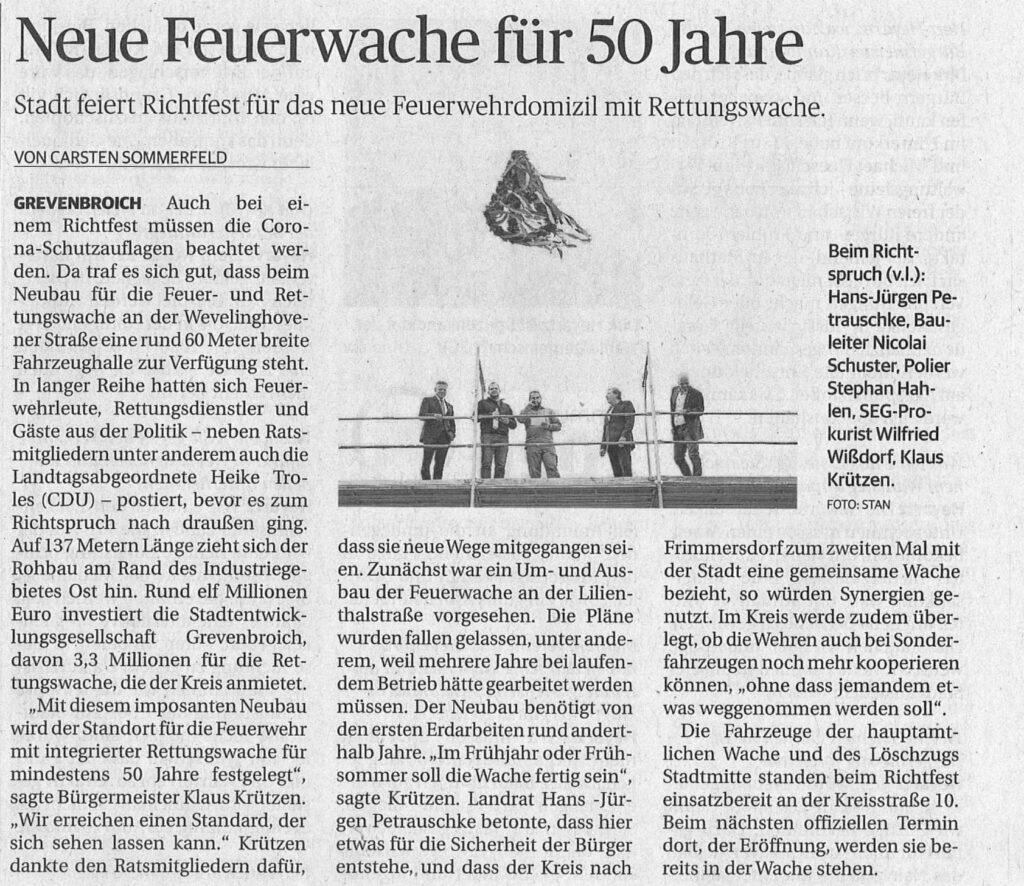 Am vergangenen Dienstag, den 01.09.2020 fand – unter Einhaltung der Corona-Schutzauflagen – das Richtfest zum Neubau der Feuer- und Rettungswache in Grevenbroich statt.